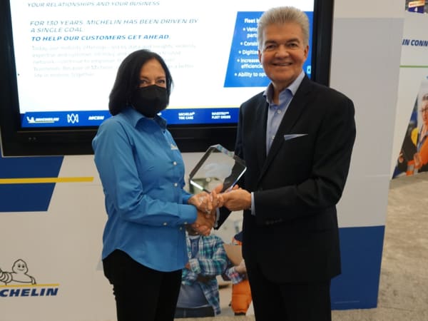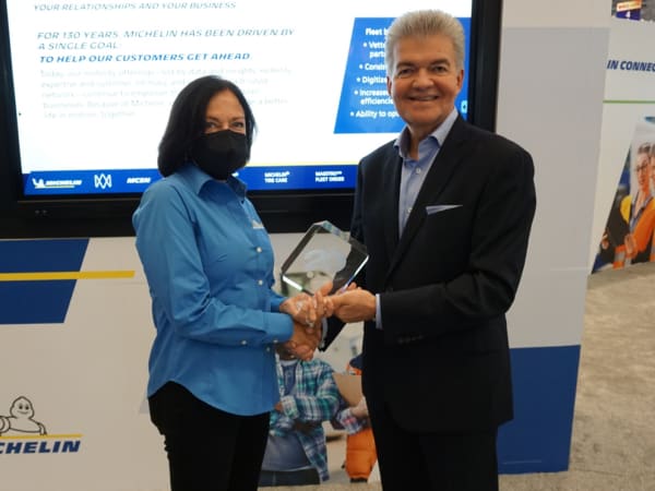 Susan Bernstein, customer engagement leader, accepts HDT's Top 20 Products award for Michelin's X One Line Energy T2 tire from HDT Publisher David Moniz.