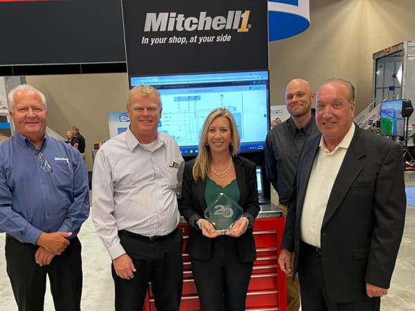 (Left to right) Dan Kincaid, senior technical editor of the commerical vehicle group; Ben Johnson, director of product management; Kristy La Page, business managers of the commerical vehicle group; Walter Schnapp, corporate account manager; and Scott DeGiorgio, general manager, accept the HDT Top 20 Products award for the TruckSeries.