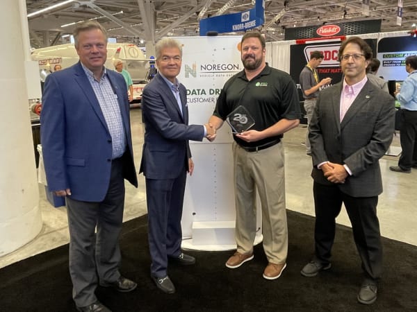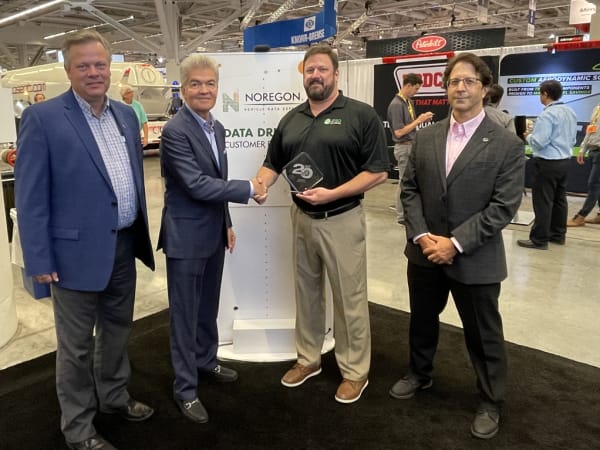 (Left to right) Scott Bolt, vice president of product management; Dave Fabrizio, vice president of marketing; and Paul Smith, vice president of professional services accept HDT's Top 20 Products awards for Noregon's NextStep Repair from HDT Publisher David Moniz.