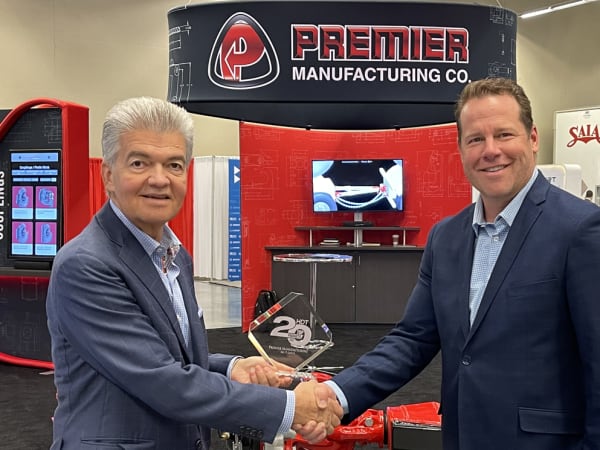 Derek Quys, director of sales, accepts HDT's Top 20 Products award for Premier Manufacturing's Saf-T-Latch from HDT Publisher David Moniz.