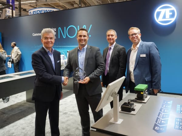 (Right to lef) Collin Shaw, director of business strategy for North America; Dirk Wohltmann, engineering director; and Julien Plenchette, vice president, Americas, commerical vehicle control system division, accept HDT's Top 20 Products award for ZF's Wabco Connected Trailer Platform from HDT Publisher David Moniz.