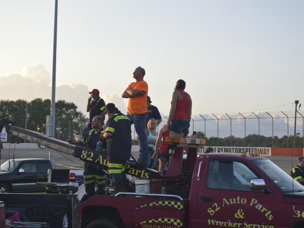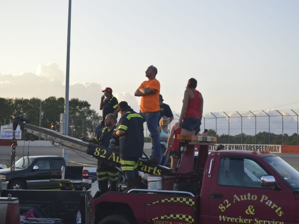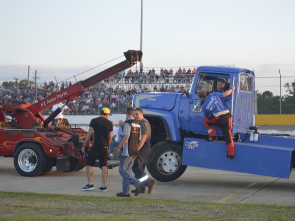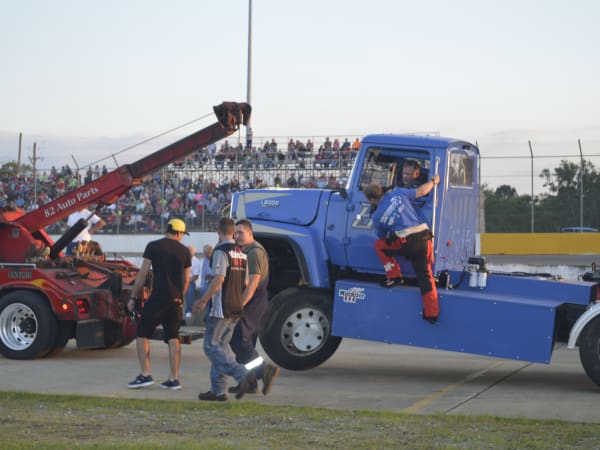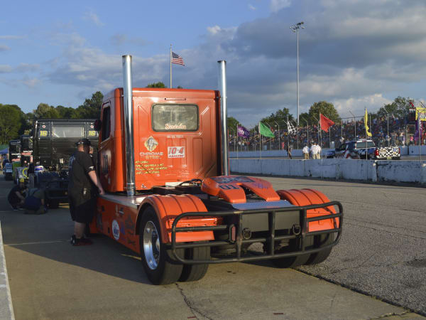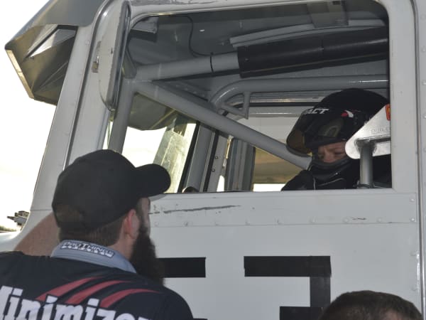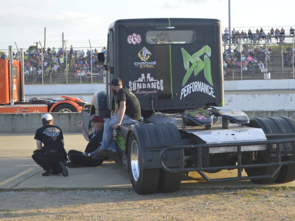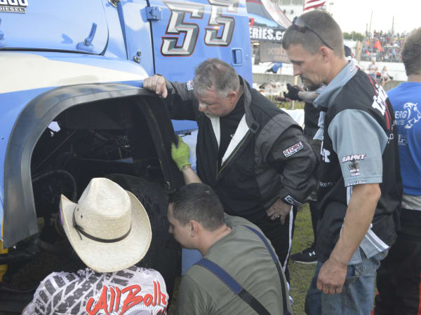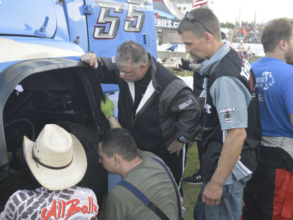 Craig Kruckeburg and the Minimizer pit crew check damage on the Ford truck.