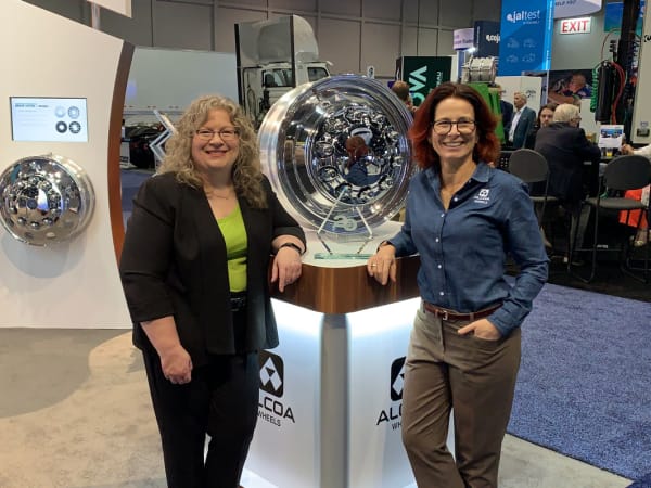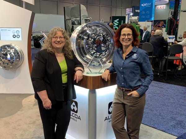 HDT Editor in Chief Deborah Lockridge, left, presents HDT Top 20 award for the Alcoa ULT36X 22.5” x 8.25” wheel to Nathalie Tessier, general manager Americas, Howmet Wheel Systems.