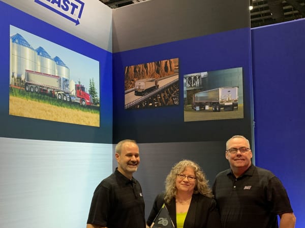 Howard Booher, left, president and chief operating officer; and Chris Cooler, VP of sales and marketing and product manager-dump trailers, accept the Top 20 award for East's Horizon round-bottom trailer.