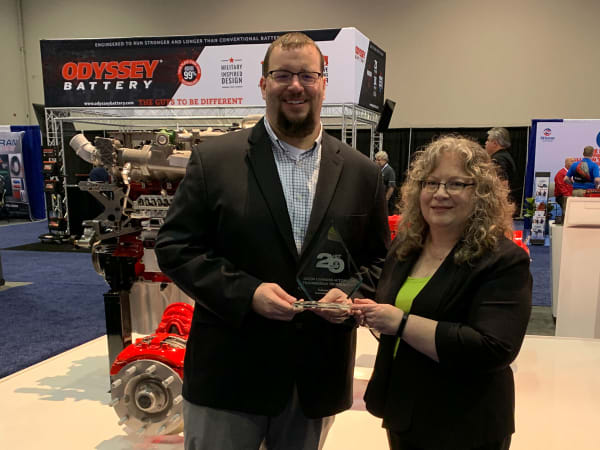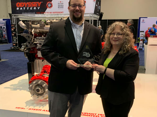 Kenneth Rocker, product manager at Eaton Cummins Automated Transmission Technologies, accepts a Top 20 award from HDT Editor in Chief Deborah Lockridge for the Endurant XD Series transmission.