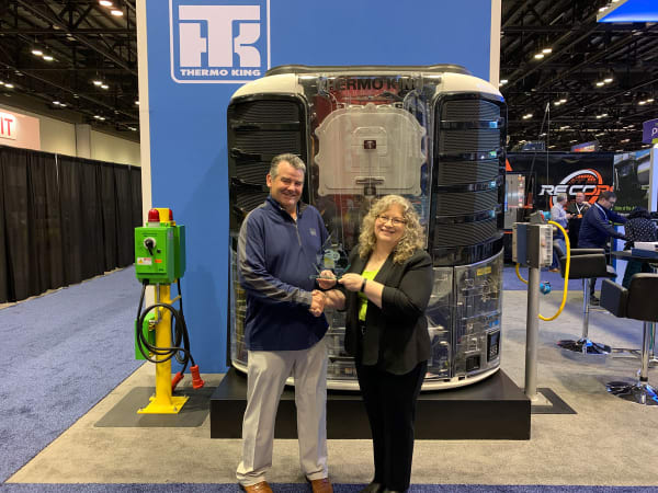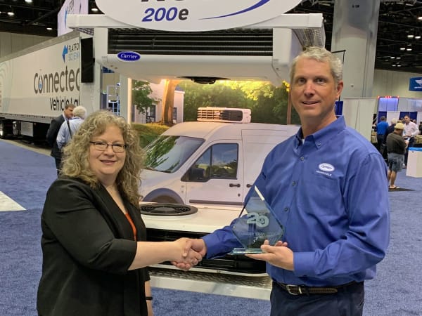 Carrier Transicold's Kevin Matney, southern region sales director, accepts the Top 20 Products award for the Neos 200e all-electric refrigeration unit for commercial vans and light-duty trucks from HDT Editor in Chief Deborah Lockridge.