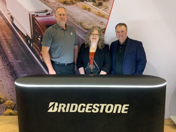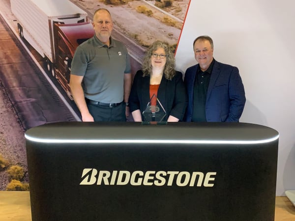 Bridgestone Director of Commercial Product Strategy Robert Hamby, left, and Vice President of Fleet Solutions Brian Cunningham, right, accept the Top 20 Products award for the Firestone Classic Line from HDT Editor in Chief Deborah Lockridge.