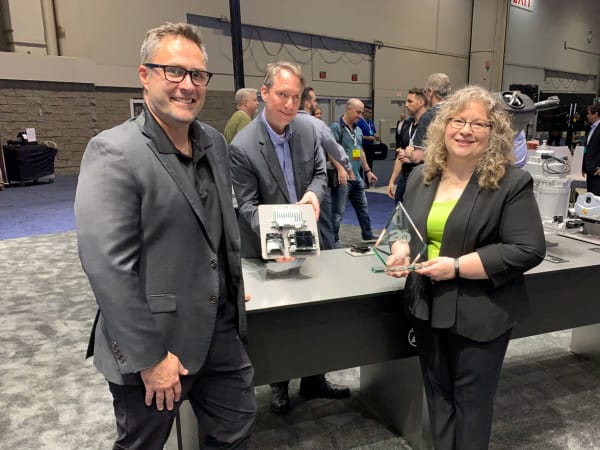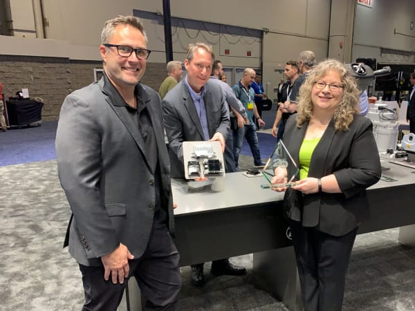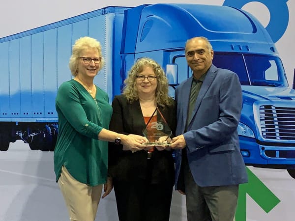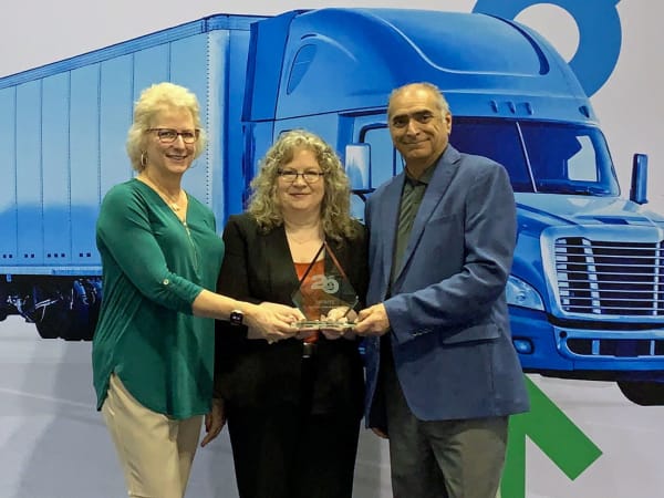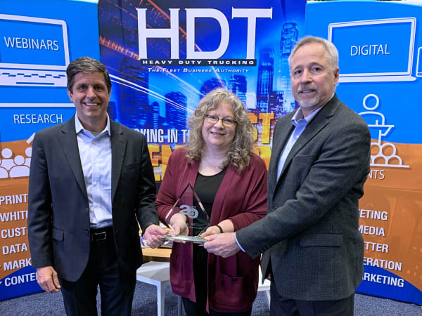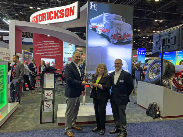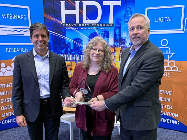 HDT's Deborah Lockridge presents a Top 20 Products award for Hendrickson’s EV Suspension Solution to Rob Stack, left, general manager for Hendrickson Truck Commercial Vehicle Systems; and Sean Whitfield, director of marketing, Truck Commercial Vehicle Systems.