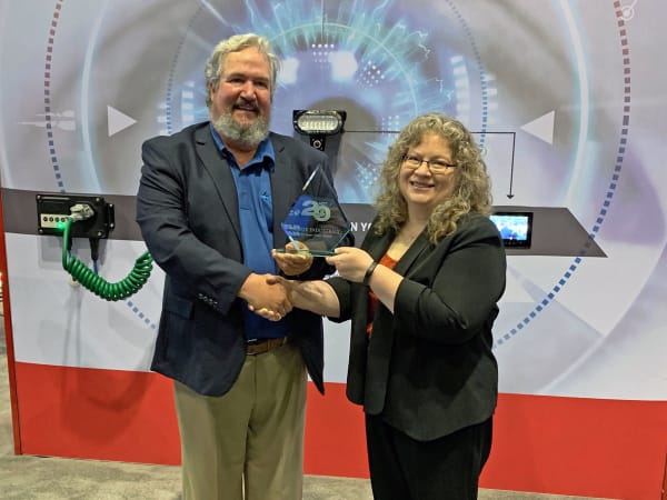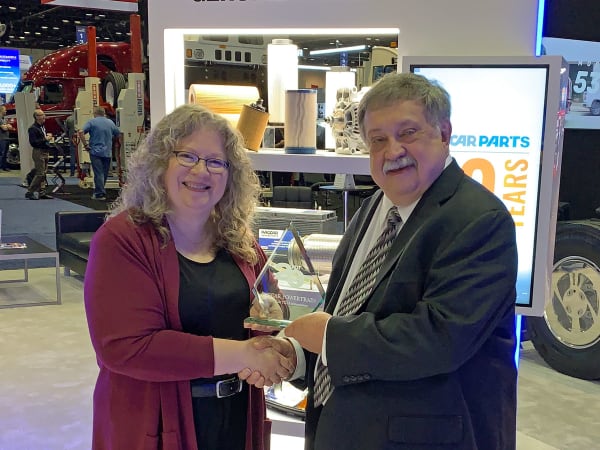 Grote Industries Director of National Fleet Sales Mark Blackford accepts the HDT Top 20 Products award for the 4See Smart Trailer System from HDT Editor in Chief Deborah Lockridge.