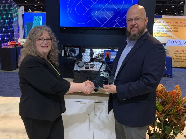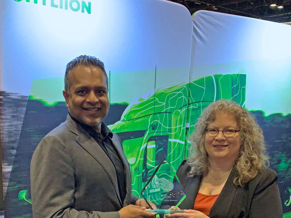 HDT Editor in Chief Deborah Lockridge, left, presents a Top 20 Products award to Matthew Carter, Trimble sales engineer, for Trimble Video Intelligence + AI — and demonstrated enhancements to the system since we first wrote about it.