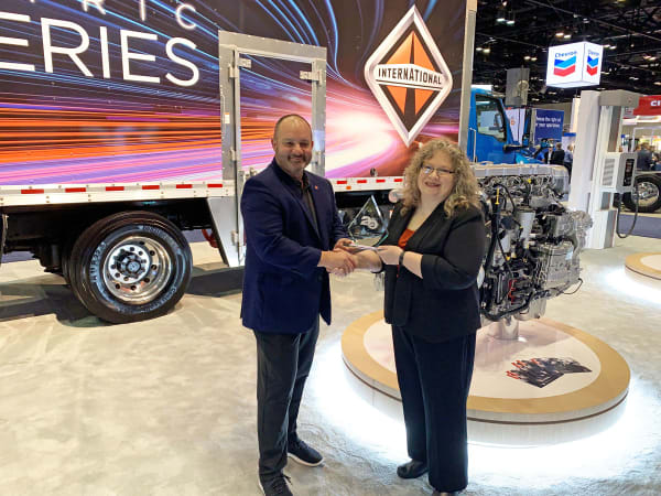 Erik Eldridge, vice president, integrated technologies sales, for Navistar, accepts the Top 20 Products award for the International S13 Integrated Powertrain from HDT Editor in Chief Deborah Lockridge.