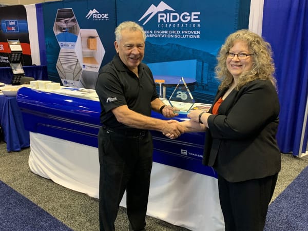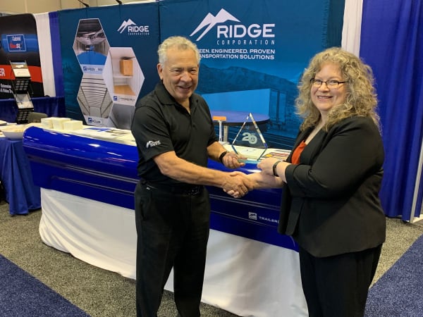 Ridge Corp. CEO and Co-Founder Gary Grandominico accepts the Top 20 Products award for the Trailer Helmet from HDT Editor in Chief Deborah Lockridge.