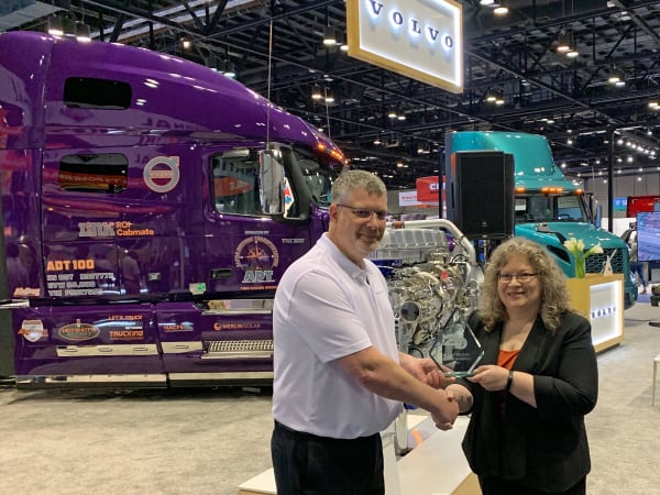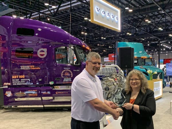 Duane Tegels, Product Marketing Manager at Volvo Trucks North America, accepts the Top 20 Products award from HDT Editor in Chief Deborah Lockridge for the I-Torque powertrain option for the D13 Turbo Compound engine.