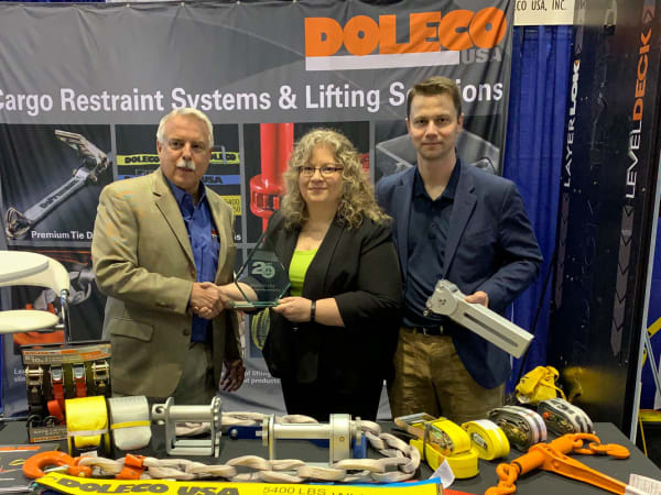 The award for Doleco USA’s Level Deck Self-Leveling Decking Beam was accepted from HDT's Deborah Lockridge by Ralph Abato, left, president/managing director; and Steve Downing, right, whose quest in the fleet world for better decking systems led to the invention of the Level Deck system.