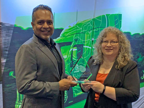 Hyliion's Hypertruck ERX powertrain earned a Top 20 Products award. Bobby Cherian, senior VP of sales, service and government affairs, accepts the trophy from HDT Editor in Chief Deborah Lockridge.