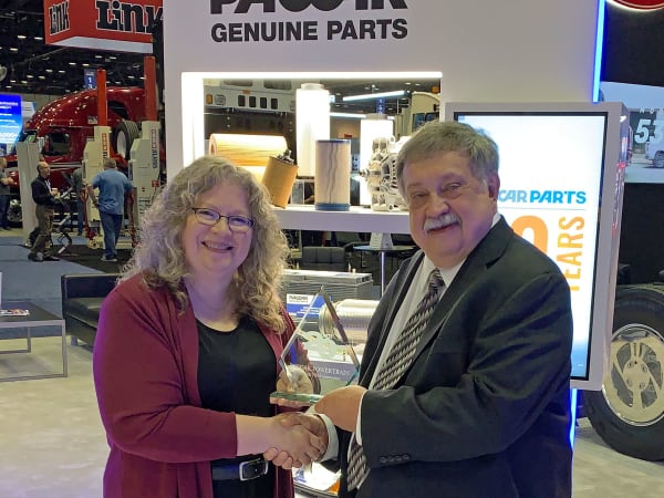 Paccar Powertrain’s Paccar TX-18 transmission earned the Top 20 Products award. Ben Watson, aftersales liaison manager, accepts the award from HDT Editor in Chief Deborah Lockridge.