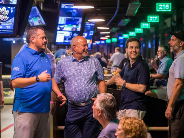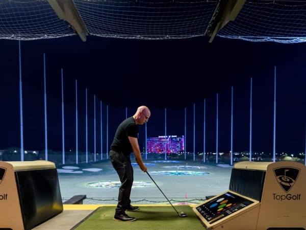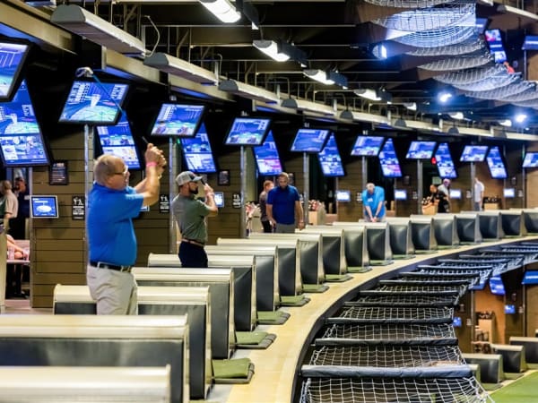 Former HDT Truck Fleet Innovator Chris Woody of M&W Logistics practices his golf skills at the HDTX TopGolf event.
