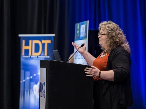 HDT Editor in Chief Deborah Lockridge and Equipment Editor Jim Park confer on the program in between sessions at HDTX 2022.