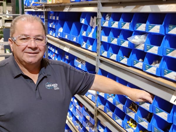 Brad Garner, SVP of Hexagon Agility FleetCare, leads a tour through the parts area of FleetCare in Salisbury.