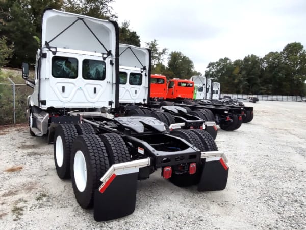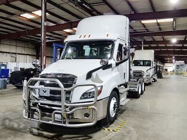 A row of new Freightliner trucks wait to get Hexagon Agility CNG / RNG fuel systems installed.