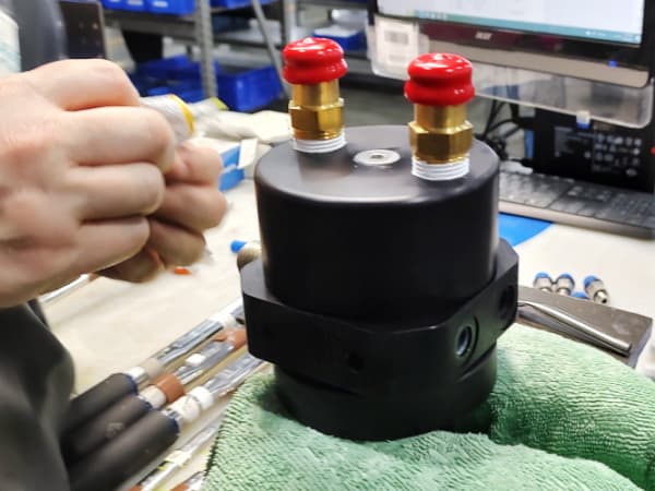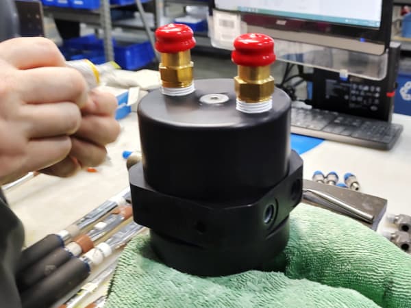 Shown at left is the high-pressure regulator subassembly and, at right, a high-pressure filter subassembly.