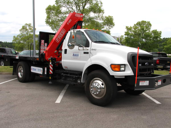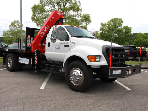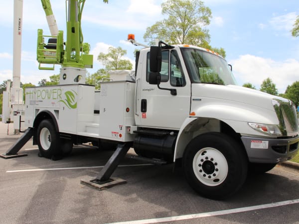 Odyne plug-in hybrid electric with hydraulic crane on a Ford F750 chassis.
