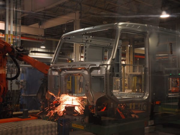 2. The basic cab structure is hand-mounted on a jig and sent into the welding area where to body panels are robotically spot-welded to the subframe of the cab.