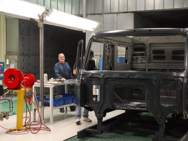 4. After the basic cab is assemble, workers fit up some interior structures and panel before the cab is primed and painted.