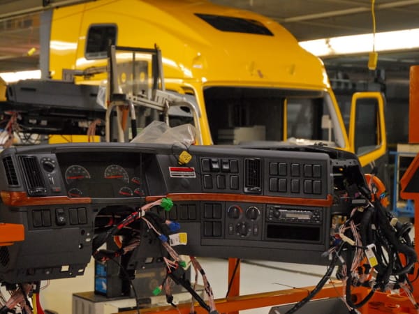 8. Dashboard assemblies that are pre-wired and configured to the customer's specifications are matched to the cab they ordered and installed before the windshield and other bit go in.