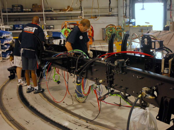 9. Way off in another part of the plant, workers begin assembling the chassis, beginning with a pair of frame rails and a few crossmembers Along the way, air and electrical lines woven into place, frame brackets are installed and the frame is prepped for painting.