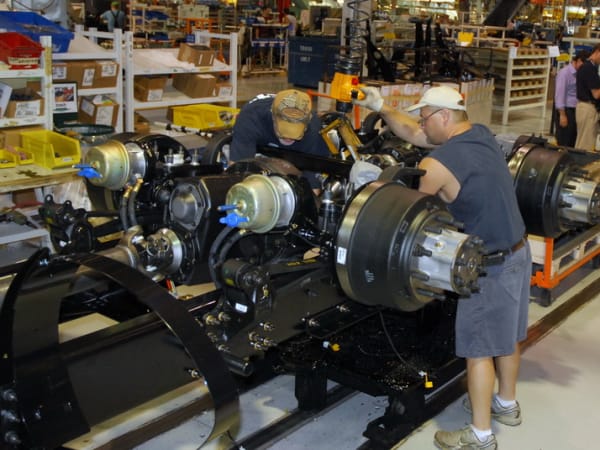 10. The axles and suspension are installed with the frame upside down so workers have better access to the parts they have to install and tighten down.