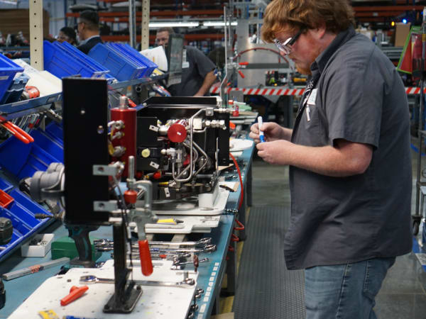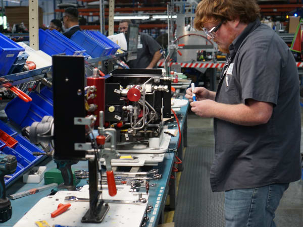 During assembly, workers put on brackets and prepare coolant, pressure and electrical lines.