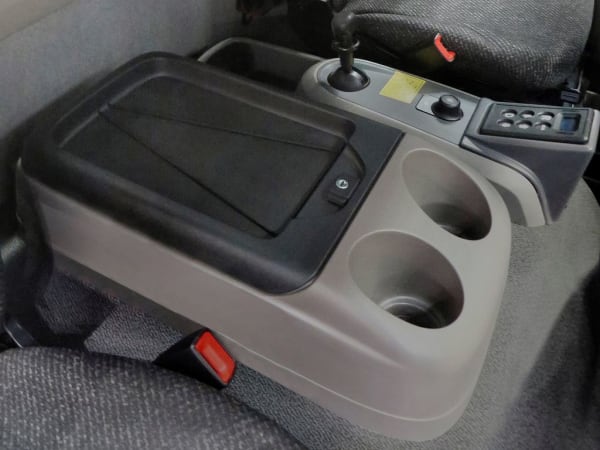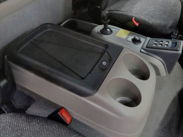 The optional single passenger seat configuration offers a large locking center console with additional storage, cup holders, parking brake, control knob for master display functions, 12-volt power supply and the new push-button shifting system for Allison automatic transmissions.