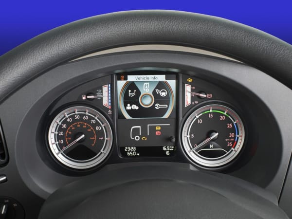 The display shows speed, engine RPM, oil level, fuel consumption, trip data, fault codes, outside air temperature, turbo pressure, PTO counter, service inspections and even an alarm clock.