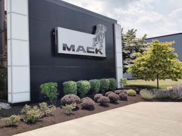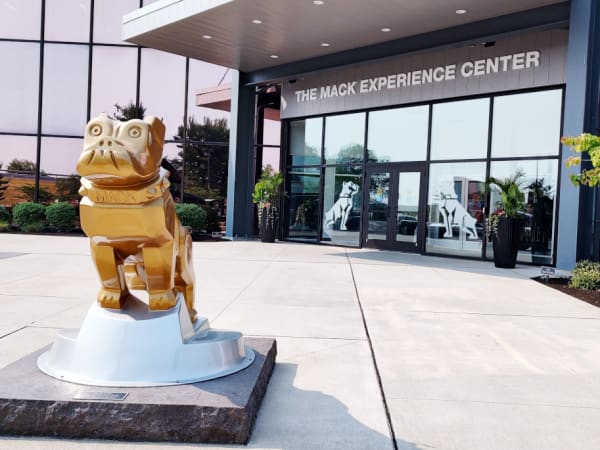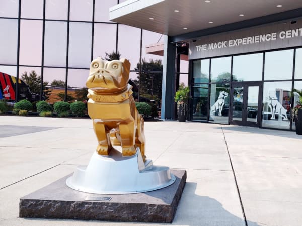 Arriving visitors are greeted by the Mack bulldog.