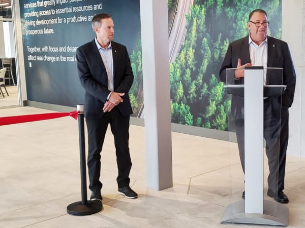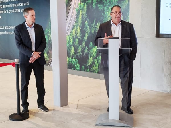 Jonathan Randall, Mack Trucks president, talks about the Mack Trucks heritage and its connection to the Lehigh Valley. Also shown is David Galbraith, vice president of global brand and marketing for Mack Trucks.