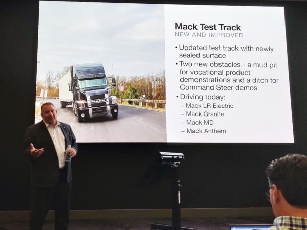 Jonathan Randall, Mack Trucks president, delivers a presentation about the test track inside the new briefing room.