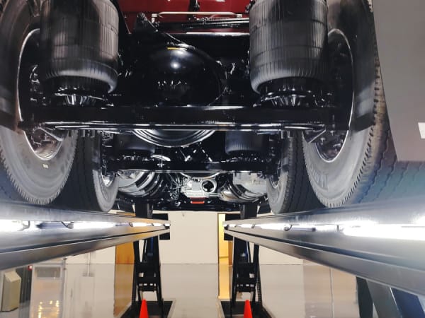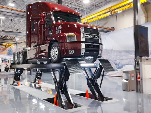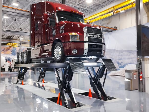 A Mack Anthem is shown atop a hydraulic lift in the product showroom of the Mack Experience Center.