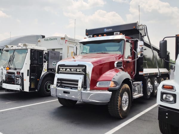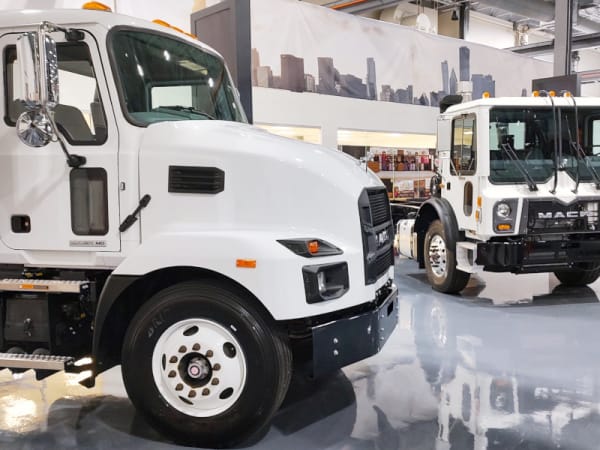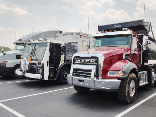 A Mack Granite, Mack LR Electric, and Mack Anthem are shown awaiting drivers at the test track.