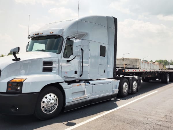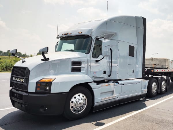 One of the Mack Anthems is ready to hit the track with a loaded trailer.