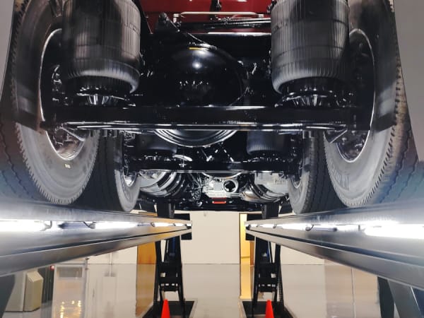 A hydraulic lift installed in the product showroom lets customers easily look beneath the trucks aided by bright illumination.