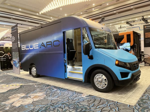 The BlueArc walk-in van from the Shyft Group is a scalable design with chassis available from Class 3 to 6. It includes level 2 and DC fast charging capability and a range of up to 150 miles.