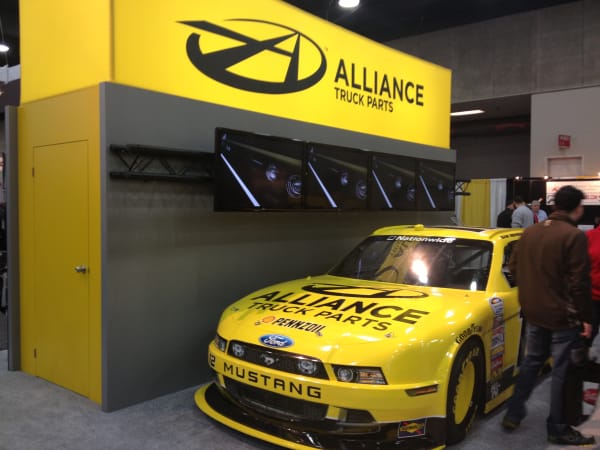 Alliance Truck Parts gets attention with their bright yellow and black color scheme and their sponsored race car at their booth.