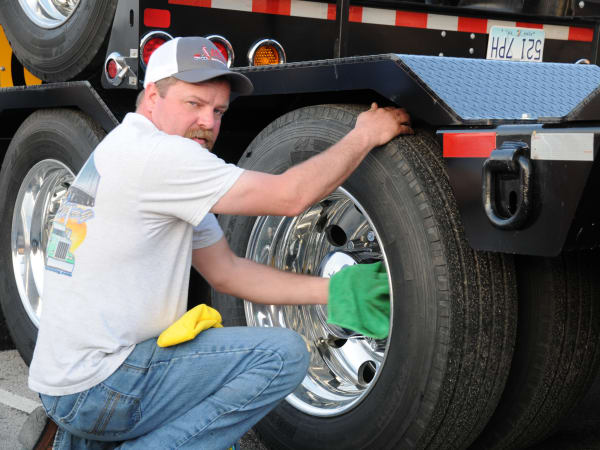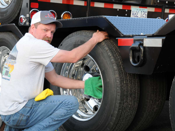 Doug Jameson of J&L Contracting applies a little elbow grease to one of the wheels on his float trailer.