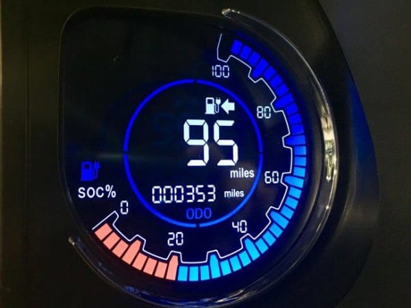 Chanje instrumentation includes this range indicator that counts down the expected miles until recharging will be required.