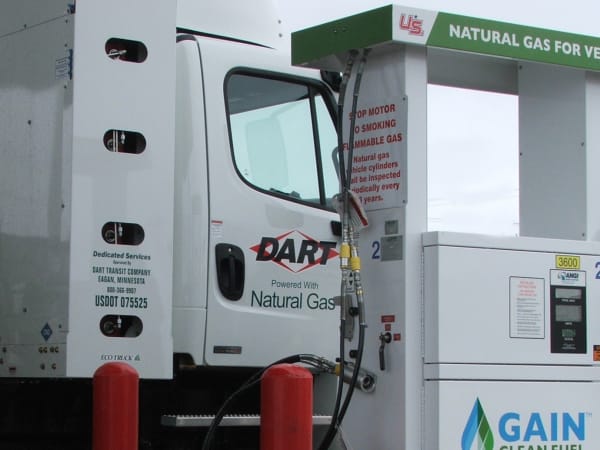 In February Dart Transit launched a small fleet of CNG powered tractors dedicated to Andersen Window Corporation. The Eco Tractors run a dedicated route between Andersen’s window and door factory in Bayport, Minnesota and its consolidation center in Menomonie, Wis. To make the Andersen Window dedicated service work, a new CNG fueling station was installed by U.S. Oil at a truckstop near Andersen’s facility in Menomonie. It is the result of a unique partnership between Dart, Andersen, U.S. Oil (a division of U.S. Venture, Inc.), Breakthrough Fuel, Excel Energy as the gas supplier, and the Cedar Country Cenex Cooperative truckstop.