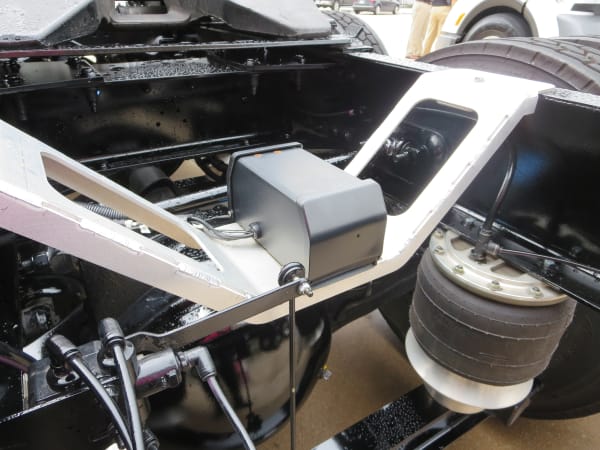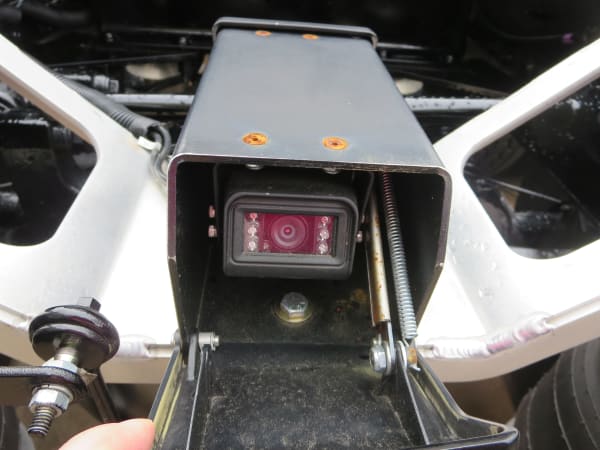 In the rear of the Walmart Technology vehicle is a set of backup cameras that allow drivers to see the trailer kingpin while backing and make sure it locks into place.