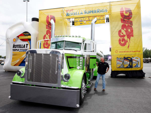 Bill Rethwisch of Tomah, Wis. captured the Best of Show honors with his green and white 2013 Peterbilt 389 during the 32nd Annual Shell Rotella SuperRigs competition, May 15-17, 2014. Photo: Shell Lubricants/Conrad Schmidt