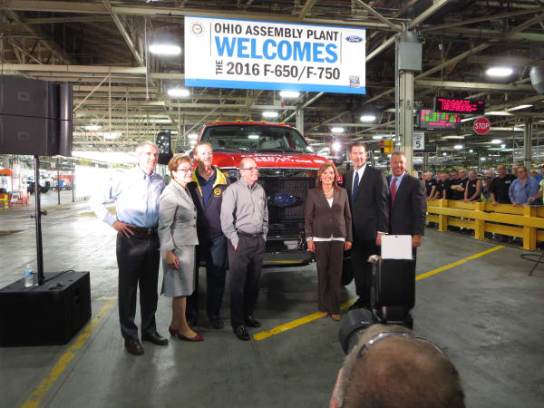 Ford and United Auto Workers officials Wednesday morning drove the symbolic first unit of its new Ford F-650/F-750 series off the line at its Ohio Assembly Plant near Avon Lake amid cheers that followed congratulatory speeches.