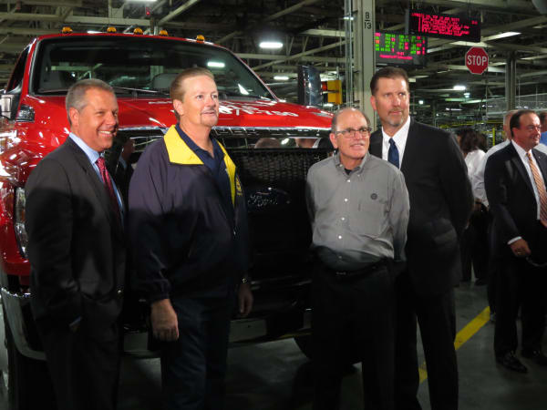 From left, Joe Hinrichs, Ford president, The Americas; Tim Rowe, UAW chairman, Ohio Assembly Plant; Greg Drudi, UAW administrative assistant; and Gary Polakowski, plant manager.